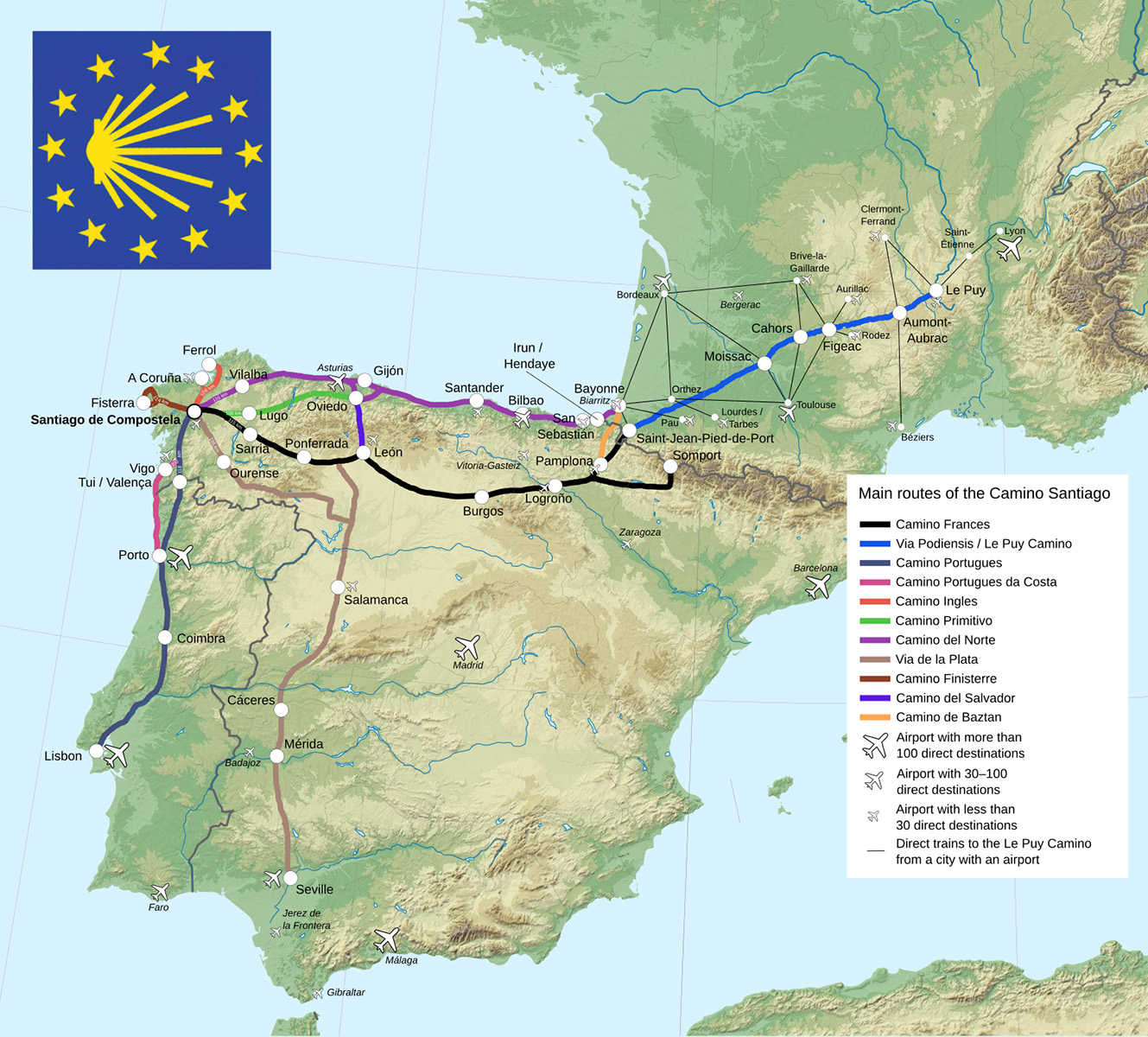 Walking medieval pilgrimage routes to Santiago de Compostela is still very popular today – especially its most famous branch, the Camino de Santiago or "The Way," which begins at St. Jean Pied de Port in the southwest corner of France. This route requires about 30 to 35 days of walking at 15 miles a day.